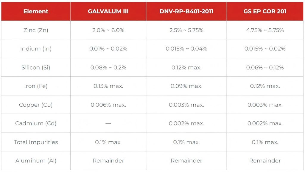 Contains 2.5%-4.5% zinc, 0.018%-0.050% indium,~1.15%–1.30% magnesium.it has similar performance to Al-Zn-In, and is used in some seawater environments with more stringent performance requirements.
