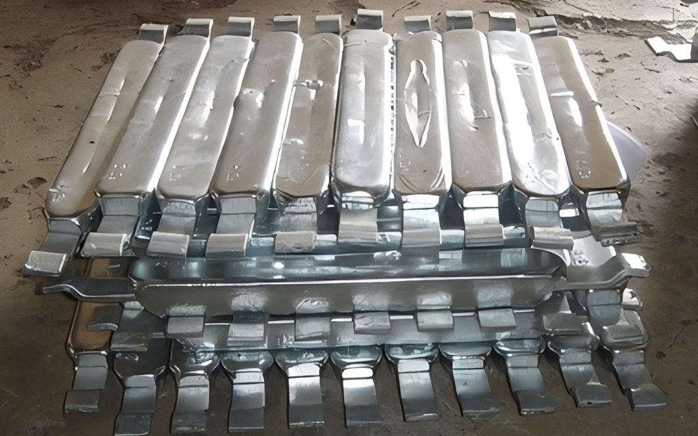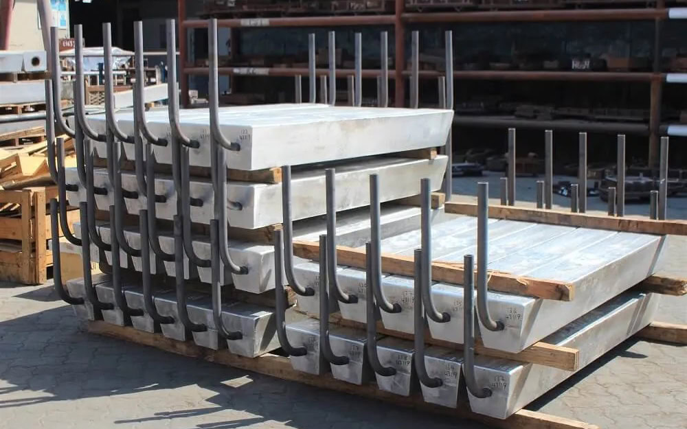 Density ≥ 98.5%. Aluminum cast anodes have a current efficiency of ≥ 85% and a capacity of ≥ 2400 Ah/kg; zinc ≥ 90%, ≥ 780 Ah/kg; magnesium ≥ 50%, ≥ 1100 Ah/kg. Defect depth ≤ 2 mm, dimensional tolerance ±3 mm, weld strength ≥ 180 MPa. Advantages include low cost and flexible shape; disadvantages include coarse grain structure, slightly higher self-corrosion, and a current efficiency 5% to 10% lower than extruded anodes.