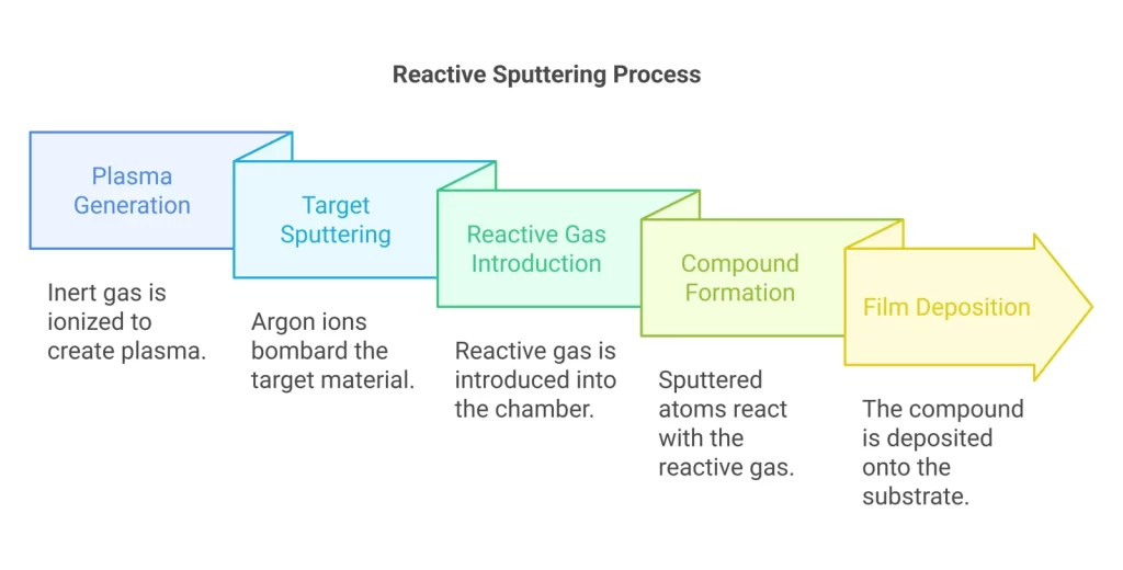 Reactive sputtering is a type of physical vapor deposition (PVD) technology. In sputtering, in addition to using inert gases (such as argon Ar), reactive gases (such as oxygen O₂, nitrogen N₂, methane CH₄, etc.) are also introduced. In a high-energy plasma environment, the reactive gas reacts chemically with the atoms sputtered from the target to generate compounds, which are deposited on the surface of the substrate to form a thin film.