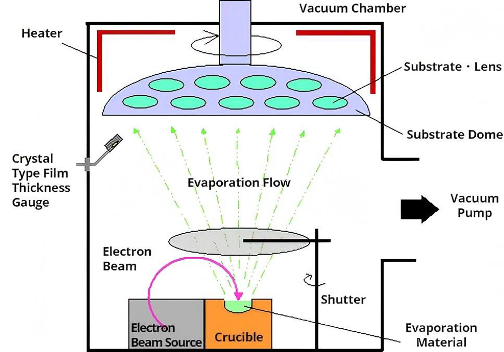Electron beam evaporation coating uses an electron gun to generate a high-speed electron beam. The electron beam is accelerated under the action of the electric field and focused on the coating material through an electromagnetic lens. The atoms or molecules obtain enough energy to transform from solid to gas to achieve evaporation.